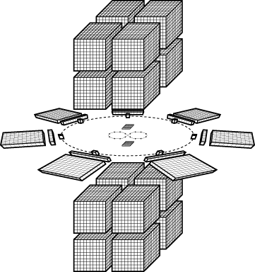 Chalice Memory Palace - Figure 1 with sixteen memory banks, seven circling server plate assemblies, two collector plates, and sixteen dancing selector blocks.